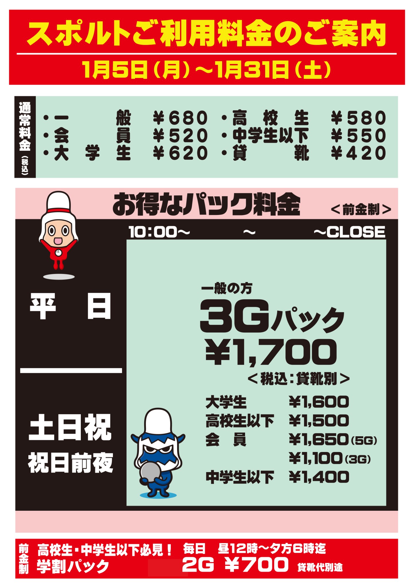 | 学割パック | 700円 | 2ゲーム | 毎日12:00~18:00 |