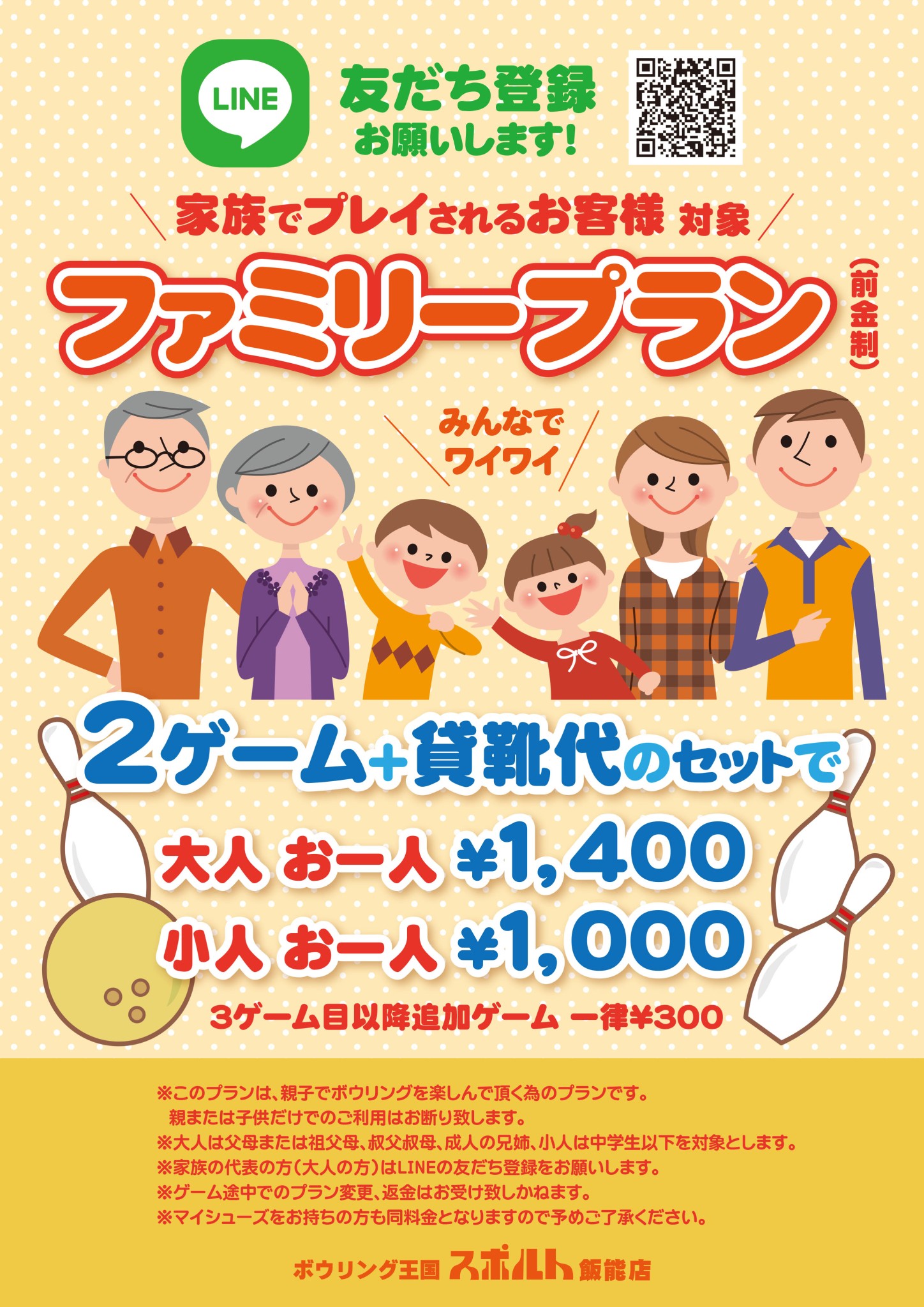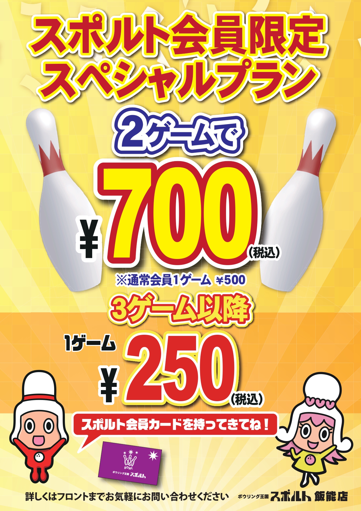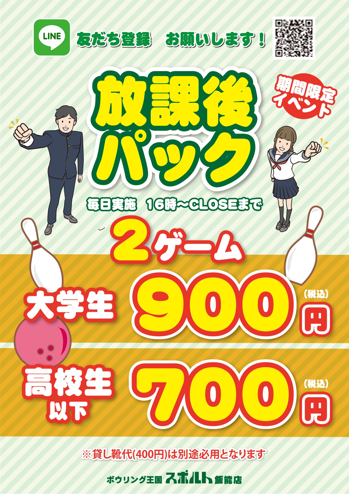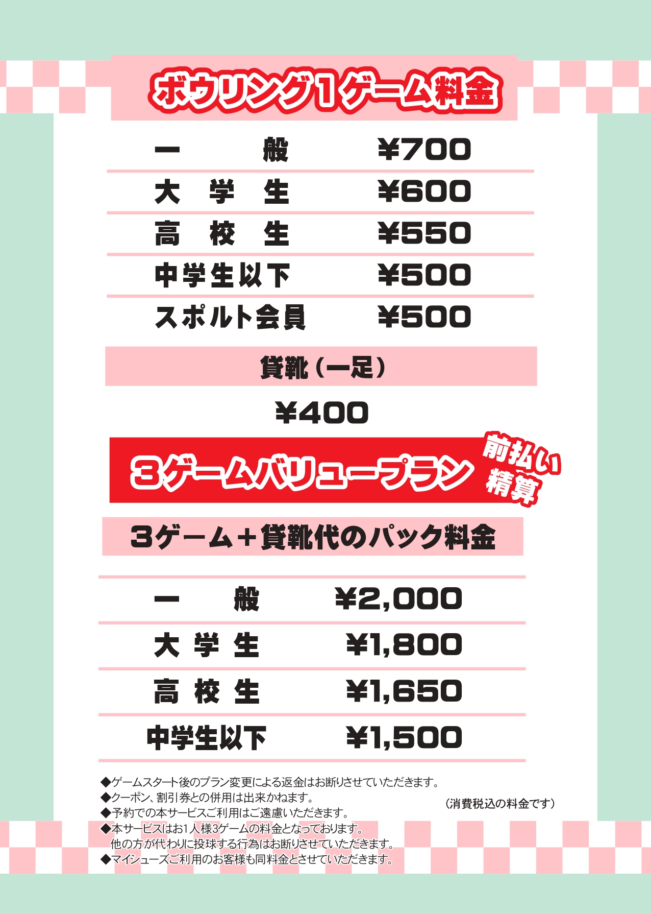 2ゲーム+貸靴のパック料金 ※3ゲーム目以降 1ゲーム300円 |