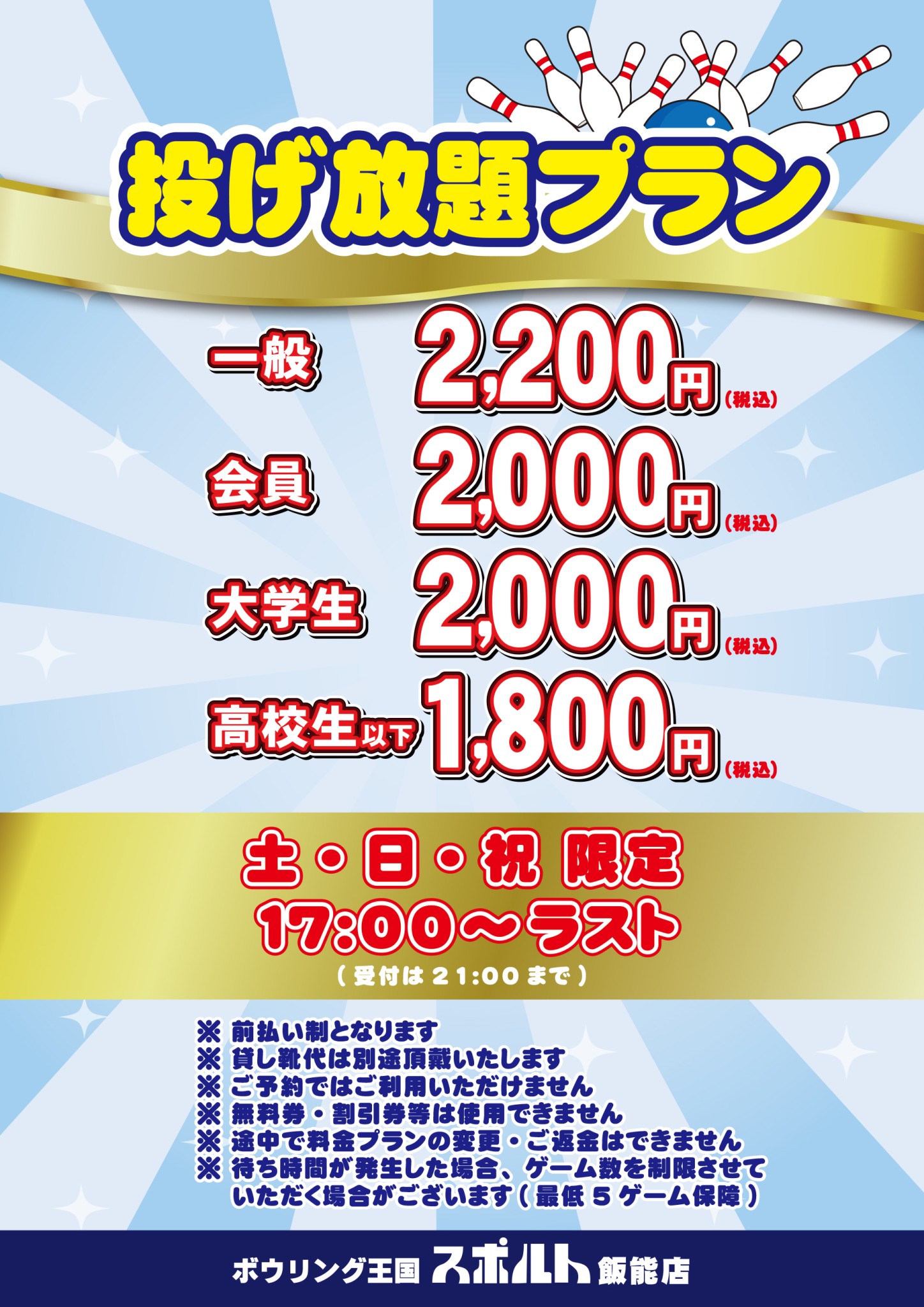 3ゲーム+貸靴のパック料金 | OPEN~CLOSE |