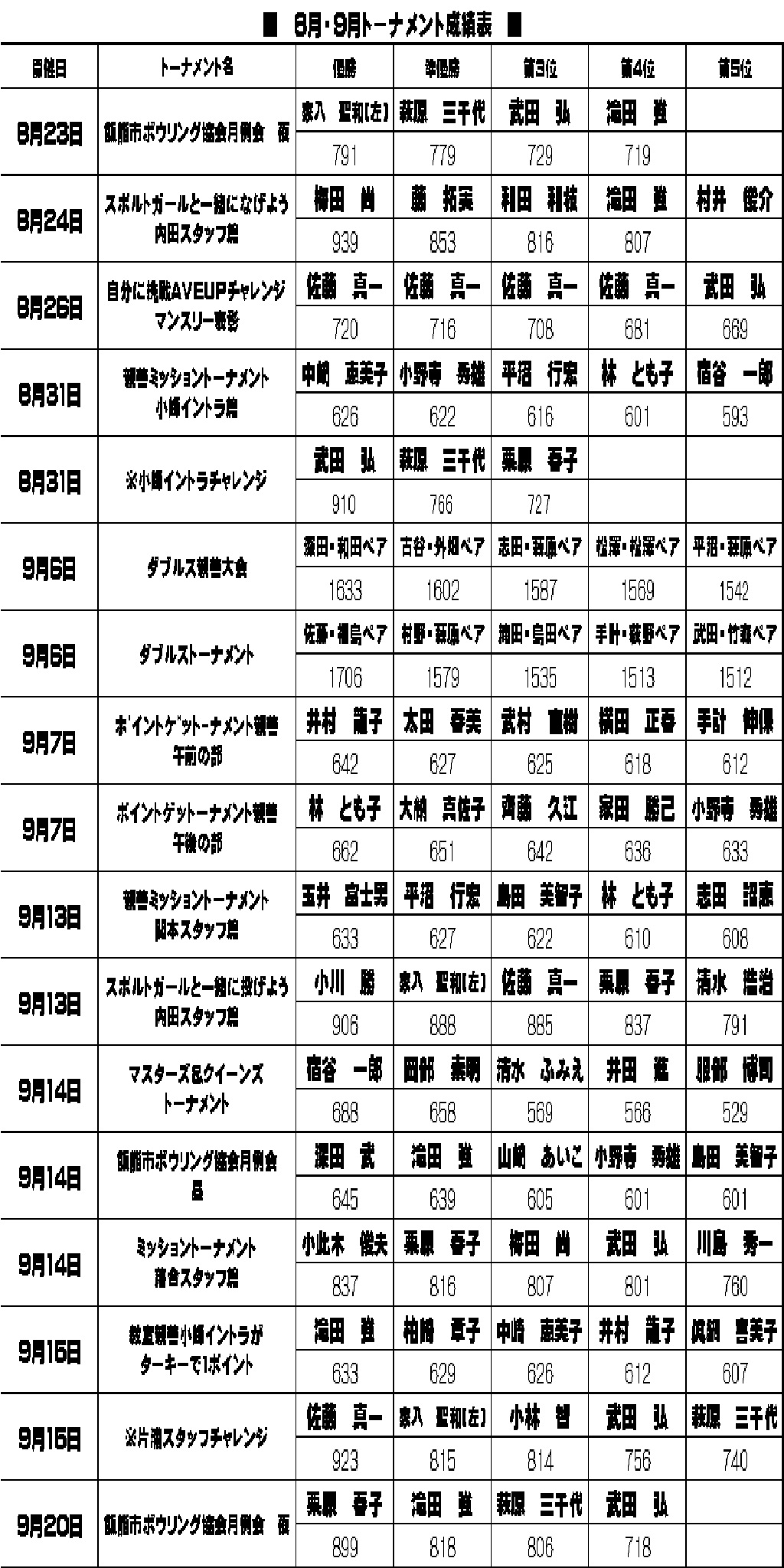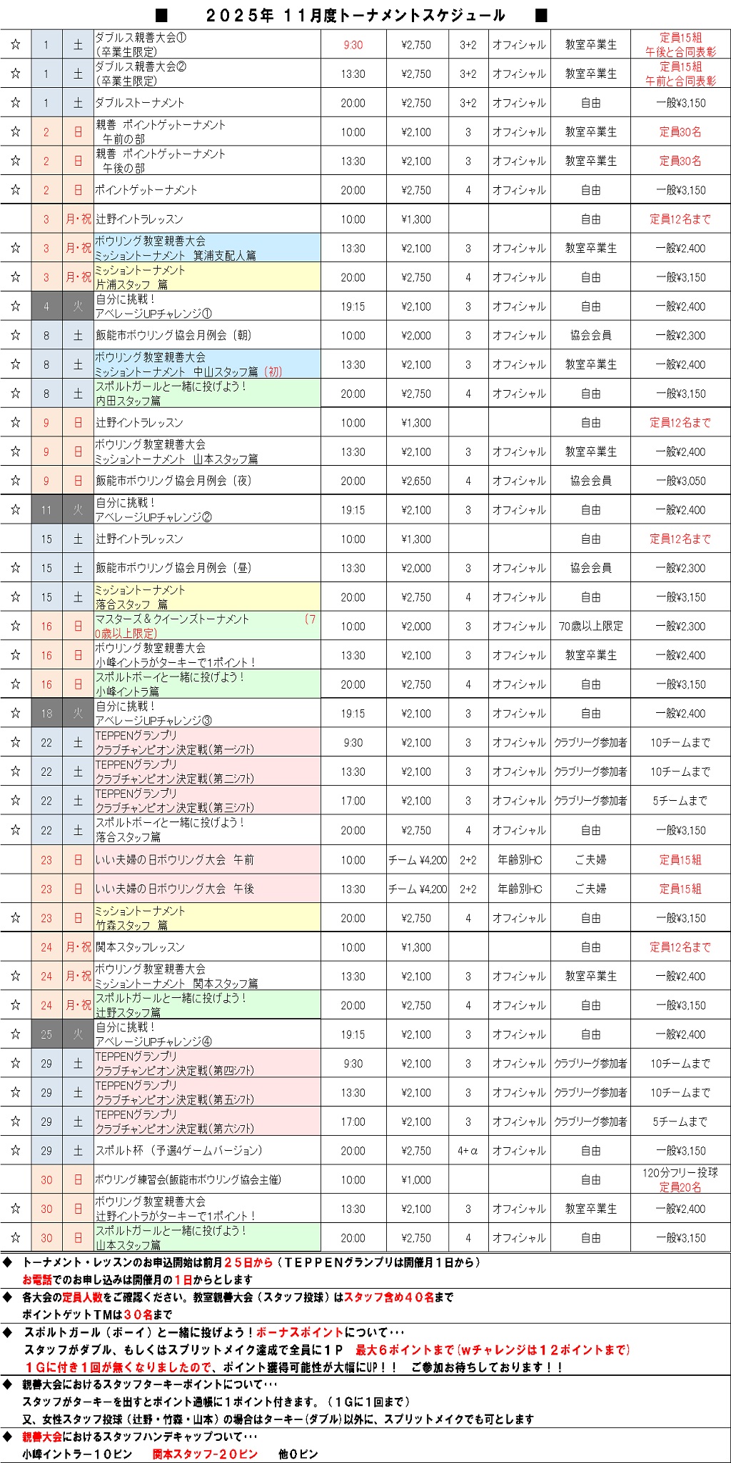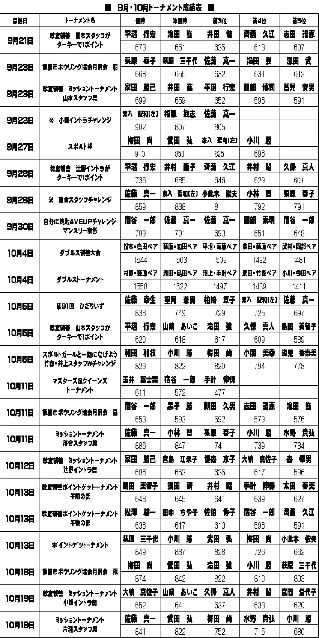 教室・大会スケジュール及び大会成績表〜ボウリング王国スポルト飯能店